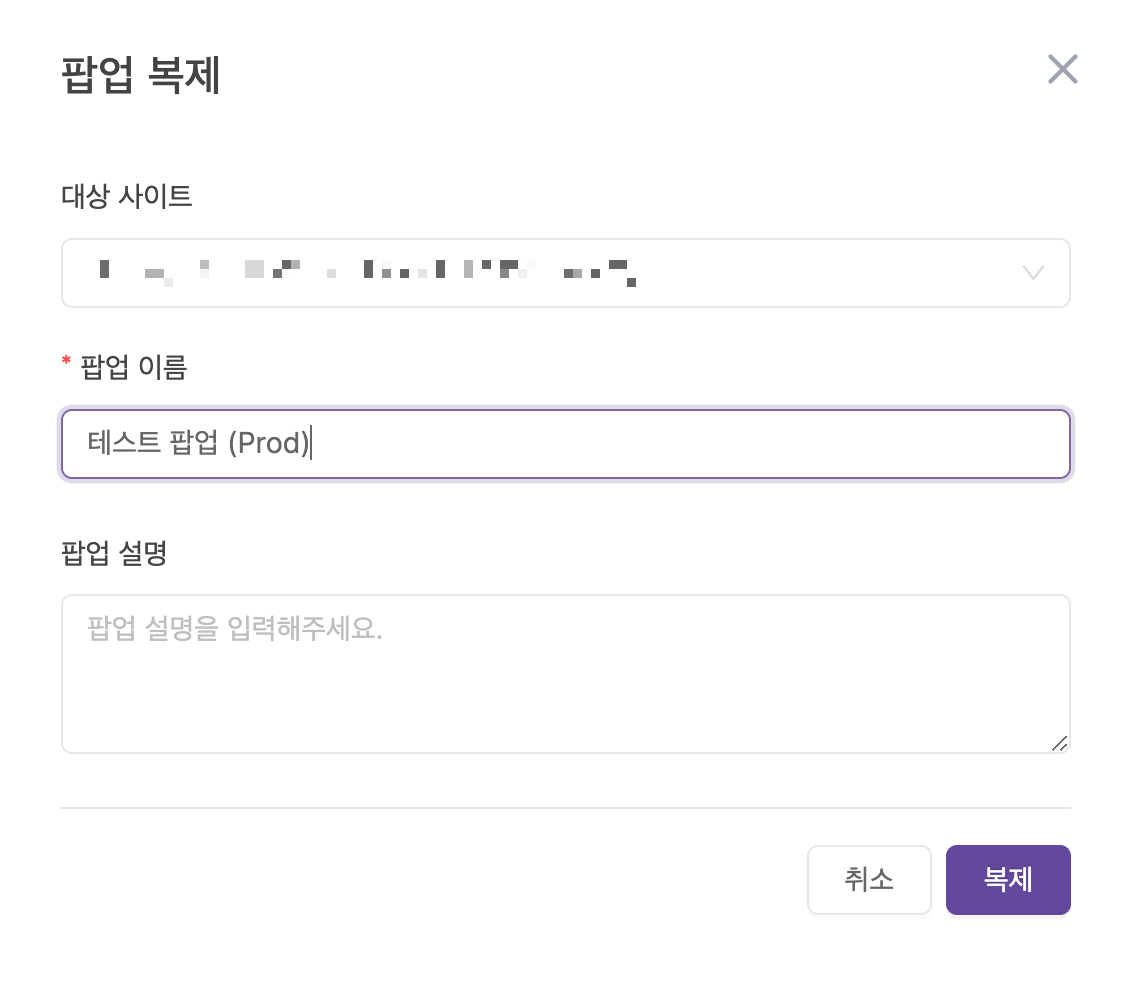다른 환경에서 만든 팝업을 아래와 같이 모달창을 통해 다른 환경으로 복제할 수 있다.