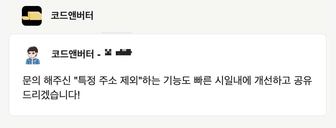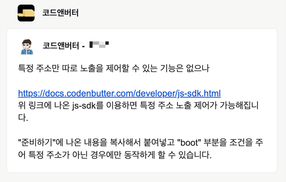 친절하게 js sdk로 특정 주소 노출 제어가 가능하다는 설명과 함께 기능 반영도 해보겠다는 답변을 받았다! 아쉽게도 이 때 js sdk를 바로 도입하지는 못 했는데, 개발 우선순위상 밀려서 다른 작업들을 먼저 치고 있었고, Next.js 환경에서 어떻게 적용할지가 좀 애매했다. 아무튼 그렇게 기능 추가를 기다리고 있었는데...