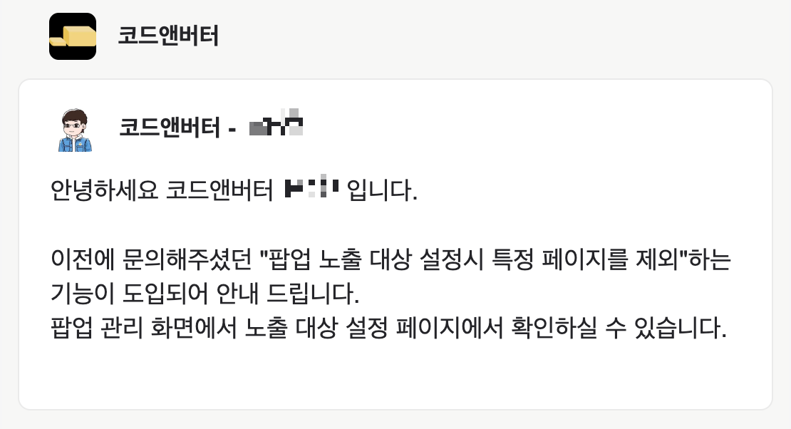 코드앤버터를 채택하게 된 큰 이유 중 하나가 바로 디테일한 설정이 가능하다는 점이다. 팝업을 보여줄 대상에 따라 페이지를 다르게 설정할 수도 있고, 기간 설정도 유연하게 되는 점이 참 좋은 것 같다. 이게 사실 일반적으로 팝업 시스템을 자체 구축한다고 하면 다 만들어야하는 부분인데... 정말 프로젝트 초기에 많은 시간을 아낄 수 있었다.