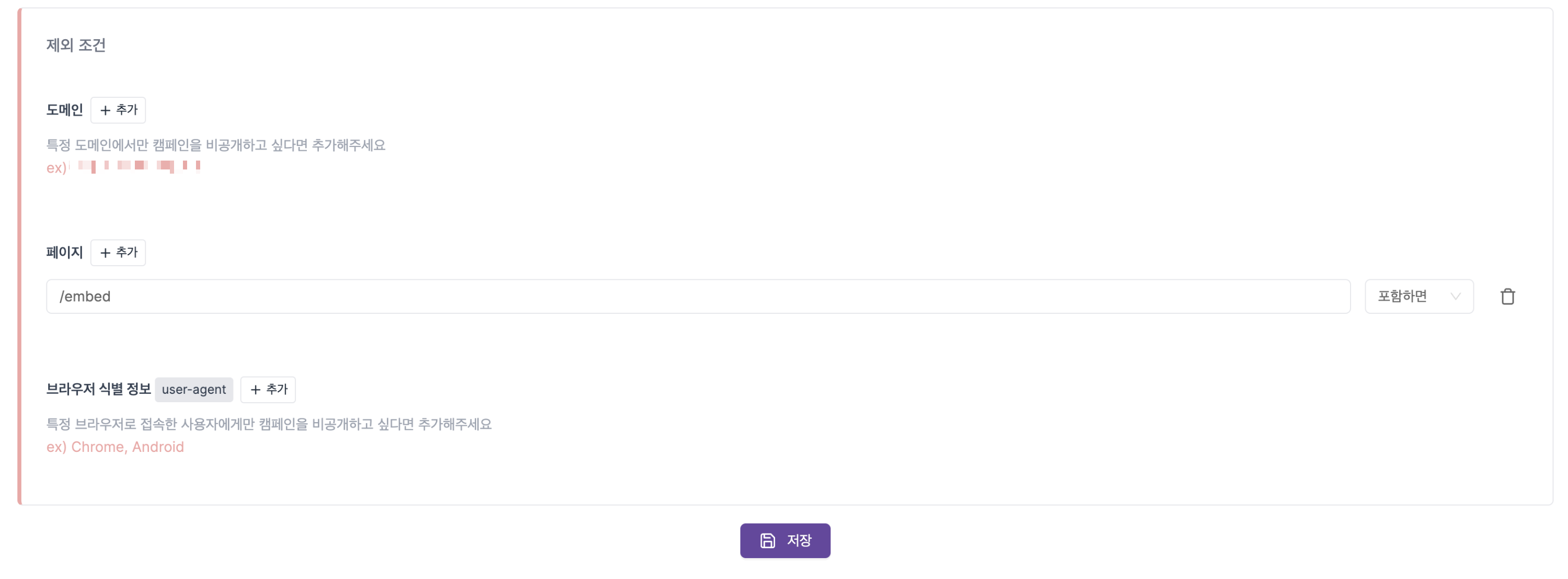 현재 프로젝트가 영상 관련 서비스라서 영상을 외부로 공유 (embed) 하는 경우가 있는데, 이 때 외부에서 iframe으로 임베드할 때도 공지 팝업이 떠버려서 불편을 겪는 유저가 있었다. 그래서 특정 주소만 노출을 안 할 수 있도록 가능한지 문의했다.