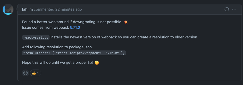 package.json 에서 react-scripts에 포함된 webpack의 버전을 수정하면 된다고 한다.